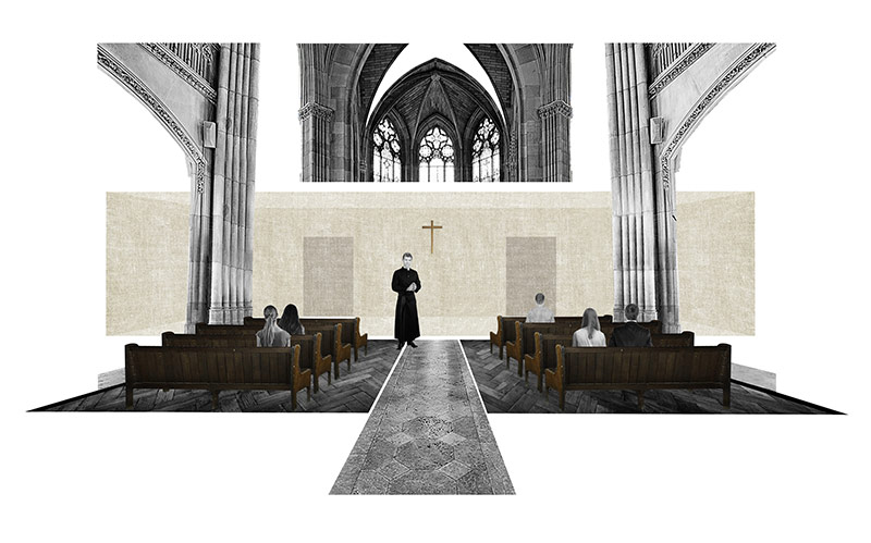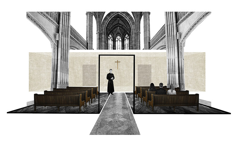 Für die Inszenierung von „Godville“ werden die Handlungsstrukturen von Dogville in einen Kirchenraum versetzt. Dieser steht symbolisch für das Haus des Glaubens und für einen Zufluchtsort für Menschen in Not. Des Weiteren diente die Kirche lange als Ort der Rechtsprechung. Die Besucher erleben die Geschichte von Dogville aus den unterschiedlichen Sichtweisen der Dorfbewohner. Sie begehen als Gemeinschaft einen theatralen Raum – Parcours, dessen Struktur von der Form des Spiels Himmel und Hölle abgeleitet ist. Dieses steht symbolisch für die Suche nach dem rechten Weg. Zudem ermöglicht die Form in der räumlichen Übersetzung zwei parallele Handlungsstränge. Die Besucher bestimmen im Kollektiv den Verlauf der Geschichte und werden dabei von mehrdeutigen Szenarien irregeführt. Analog zu Dogville lässt die Inszenierung viel Raum für Interpretationen, wobei jede Handlung ihre Konsequenz mit sich trägt.