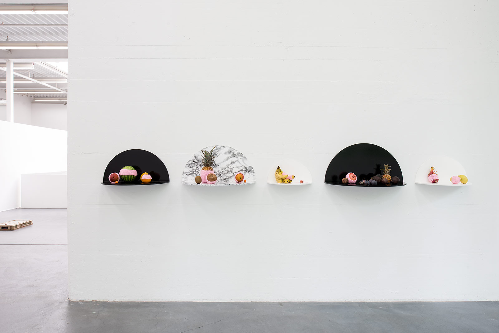 „Five displays with objects“ nennt Aline Stalder ihre Arbeit bestehend aus handgefertigten Tablaren, auf denen sie eine Auswahl an exotischen Früchten arrangiert hat im Stile von klassischen Vanitas Stilleben. Ein Teil der Früchte trägt passgenaue und von Hand gestrickte Schutzhüllen aus rosafarbener Wolle.