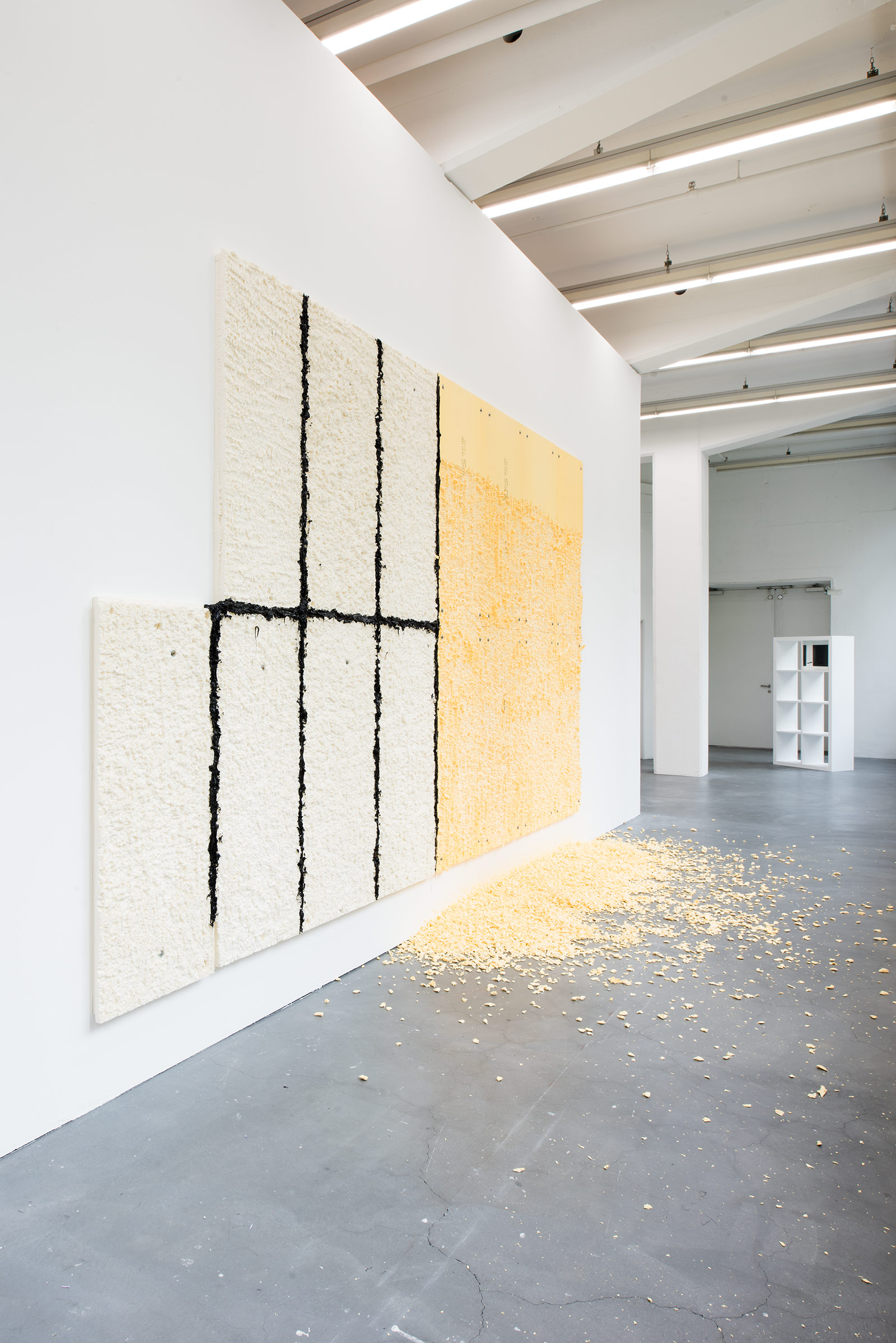 Florian Thates Arbeit „Kunsthaus Baselland“ ist eine in Styrodurplatten gekratzte Zeichnung, die mit Klebstoff und Schrauben an der Wand befestigt sind. Jedes der vier Felder zeigt die Anhäufung von Material, das durch die Ritzgesten entsteht, die den Bildprozess in seiner Zeitlichkeit nachempfinden lassen.