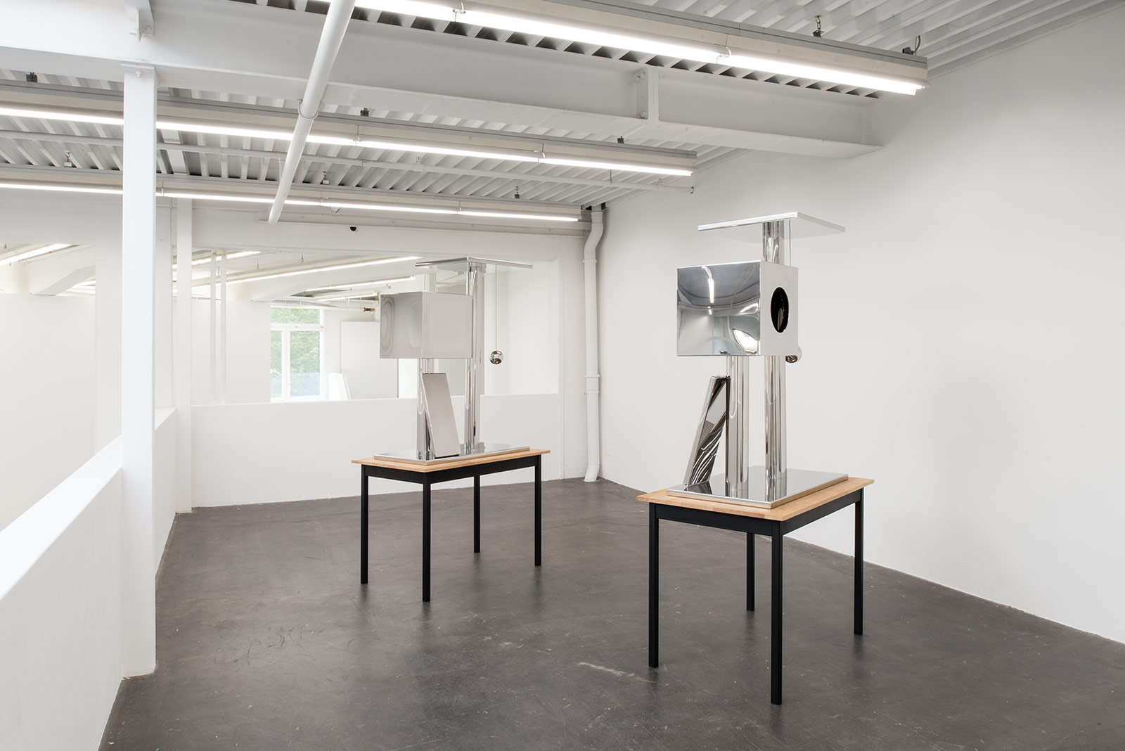 Die Installation „Toter Winkel“ zeigt zwei identische Objekte aus hochpoliertem Chromstahl auf zwei ebenfalls identischen Tischen aus lackiertem MDF und Stahl. Die Form der beiden Skulpturen entspricht derjenigen von Katzenbäumen, die sich hier jedoch nur durch die Reflexion ihrer Umgebung manifestieren. Die beiden Objekte sind von Tobias Nussbaumer so ausgerichtet und im Raum positioniert, dass sie sich endlos ineinander spiegeln.