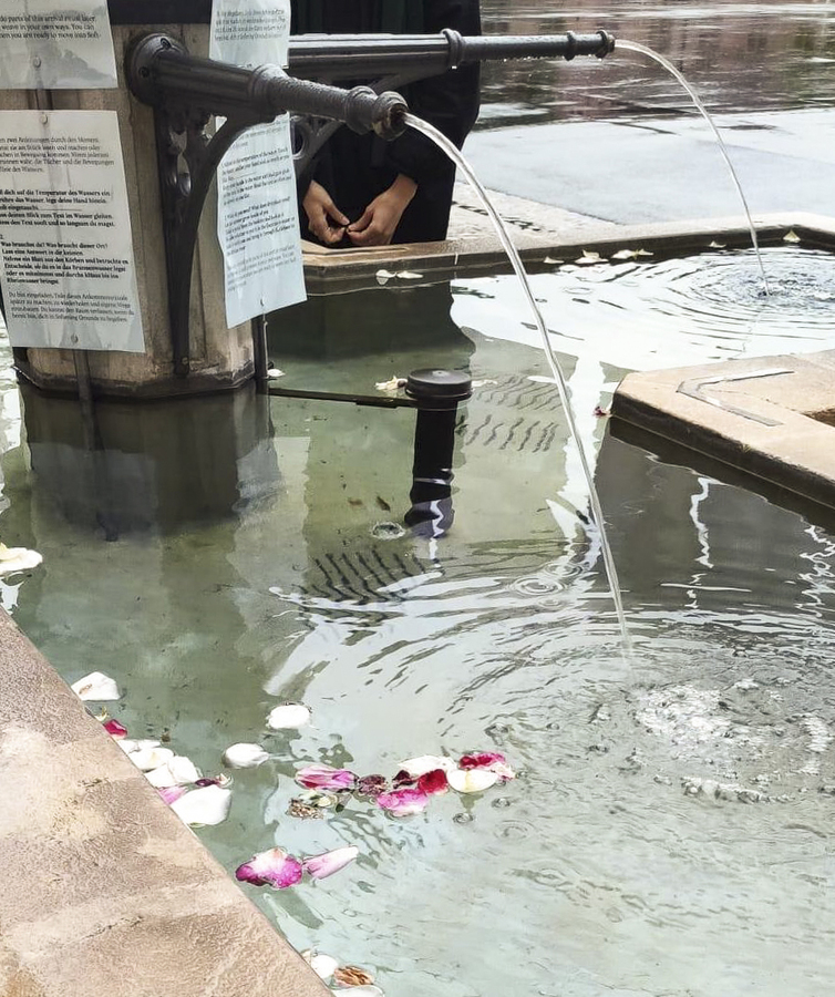 Ich habe unterschiedliche Erdungsräume gestaltet. Unter anderem «Gehen gehen», ein Ritual für Begegnungen mit und in einem Waldgebiet. Und gemeinsam mit Moritz Rubitschung «arriving in the current mo(ve)ment»: ein Raum rund um einen Brunnen, in dem Menschen in der Achtsamkeit für mehr-als-menschliche Wesen und Intuition im Geben und Nehmen ankommen können.