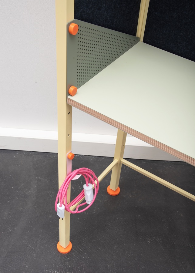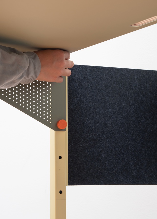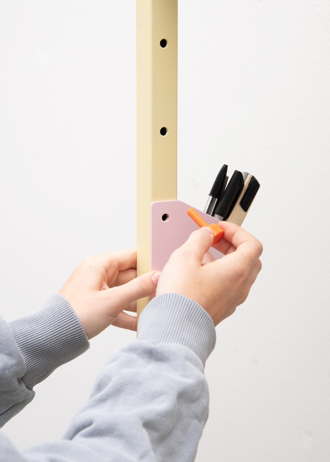 Als Regal mit integrierter, höhenverstellbarer Arbeitsfläche bietet Naro Stauraum und ermöglicht ergonomisches Arbeiten im Sitzen oder Stehen. Es fügt sich harmonisch in den Wohnraum ein, ohne durch eine typische Bürooptik zu stören. Magnetische Stifte fixieren die Regalböden und Arbeitsfläche am Regalrahmen. Zusätzliche Add-Ons und Wandhalterungen sorgen für individuelle Anpassung und mehr Stabilität.