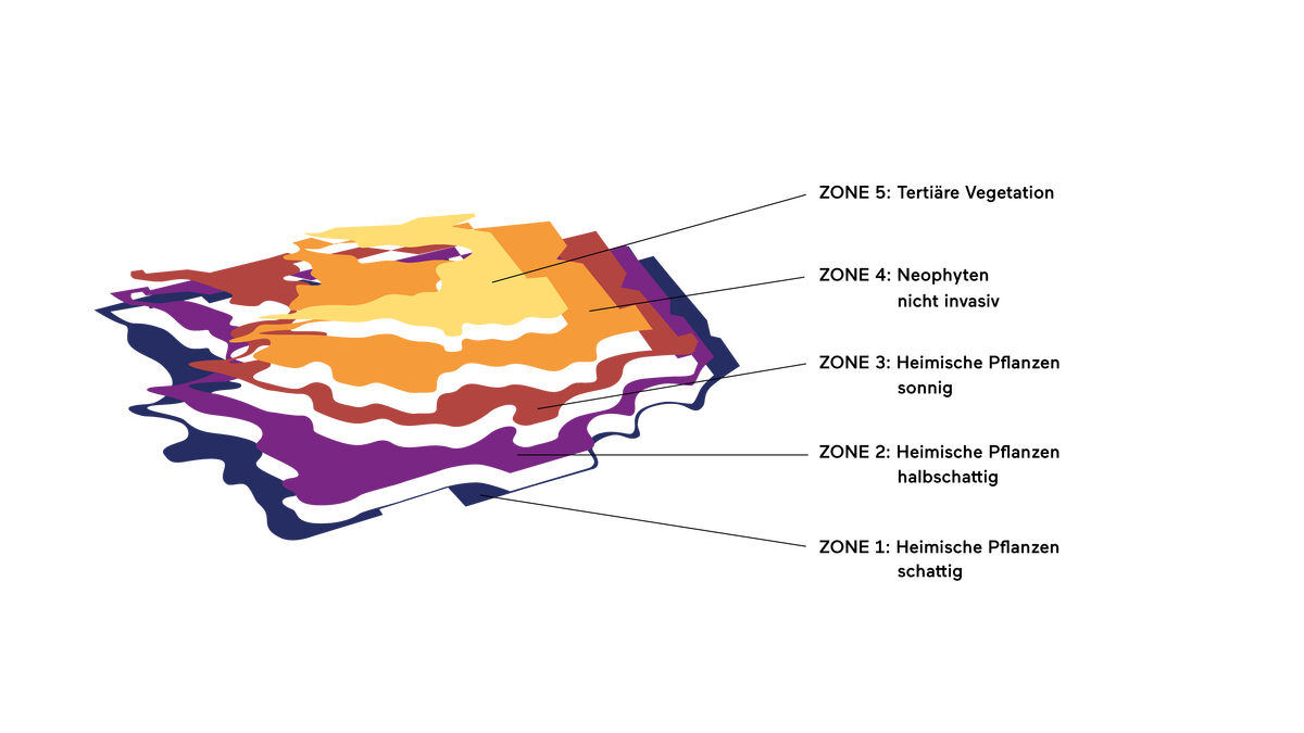 Seine Form entstand aus dem Zusammenspiel von Sonne, Bäumen und Gebäuden, deren Schatten fünf Sonnenzonen offenbarten. Hier wird gezeigt, welche Arten heimisch sind, welche sich neu angesiedelt haben und welche Pflanzen aus dem Erdzeitalter Tertiär heute und künftig wieder an Bedeutung gewinnen könnten.