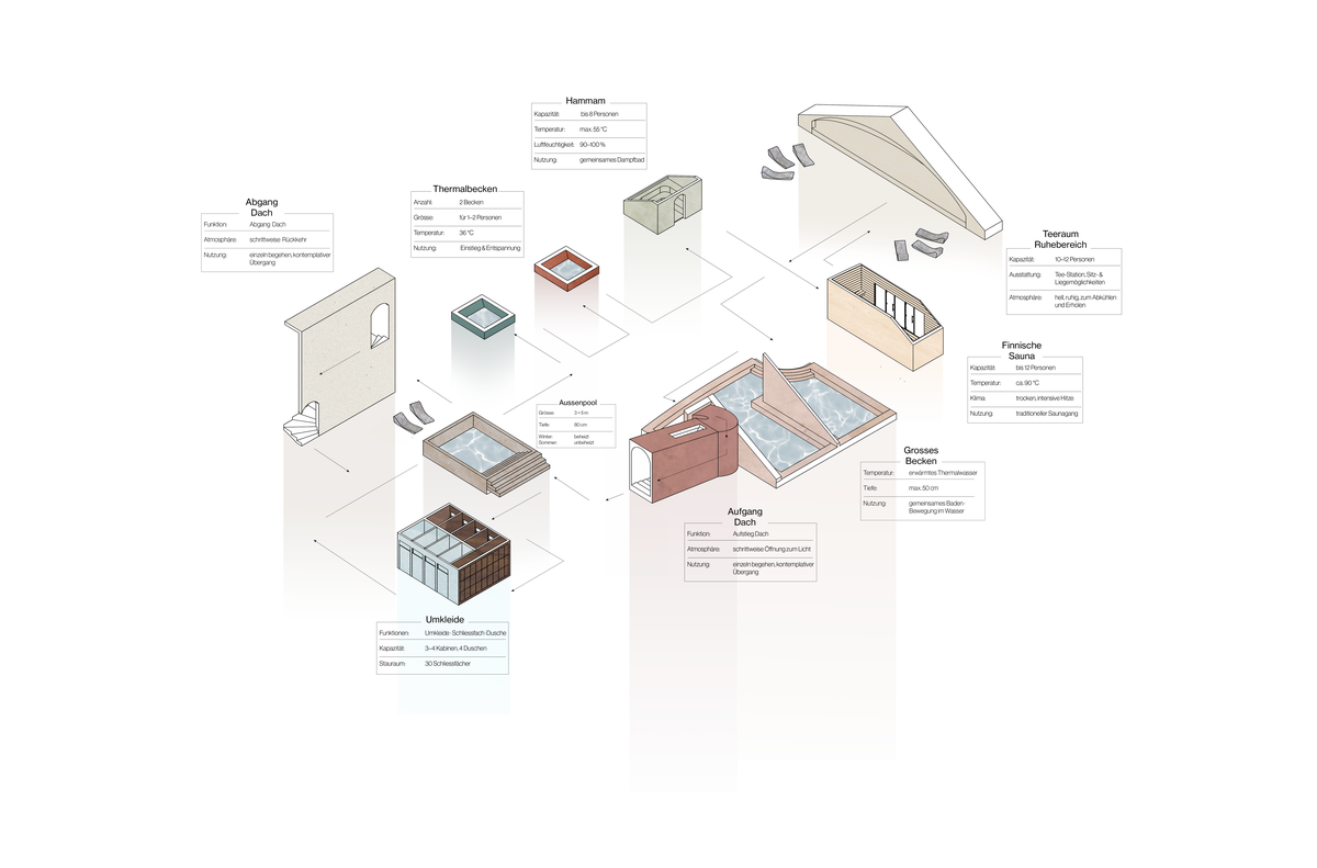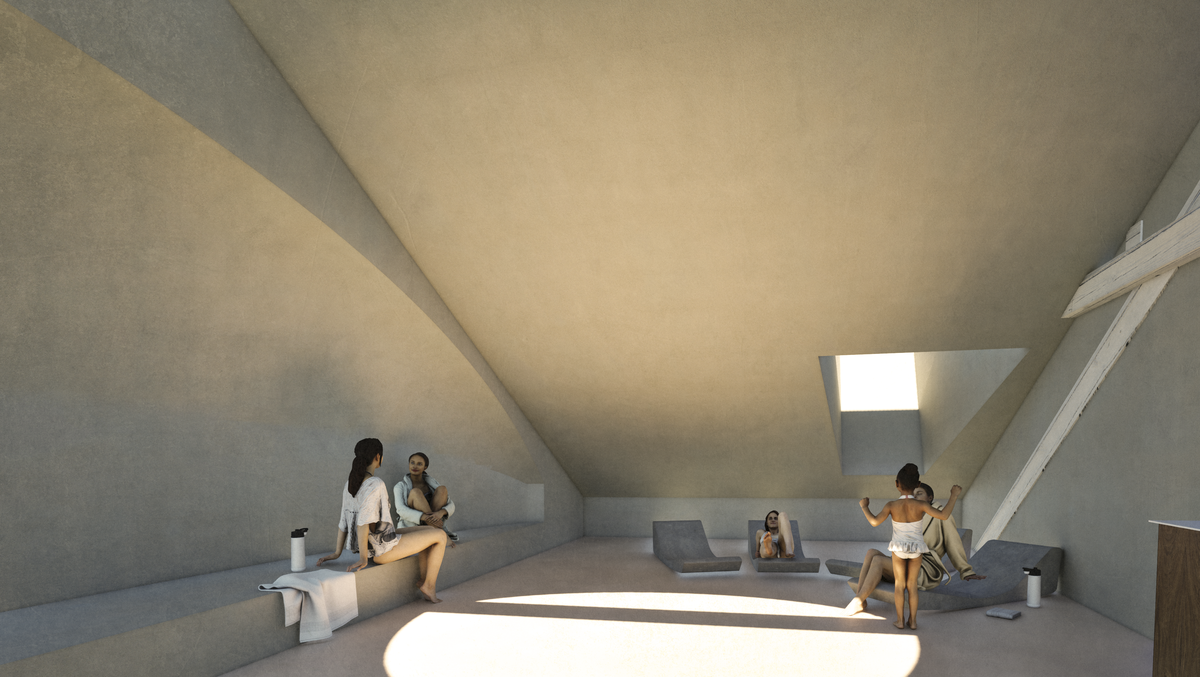 Das Tejado-Bad ist ein atmosphärisches innenarchitektonisches Projekt im Dachstock der Kaserne Basel. Der ungenutzte Raum wird mit gezielten Eingriffen aktiviert und bietet Frauen einen geschützten Ort für Rückzug, Wärme und Zugehörigkeit. In einer Choreografie aus Dunkelheit, Wasser und Licht entsteht ein Bad, das Ruhe und Heilung ermöglicht.
